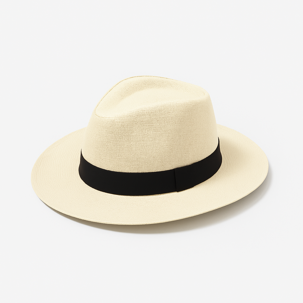 Deux personnes portant des chapeaux Panama blancs élégants, posant avec style. Mode estivale, accessoires chics, tendance chapeau classique.