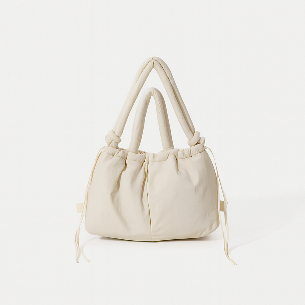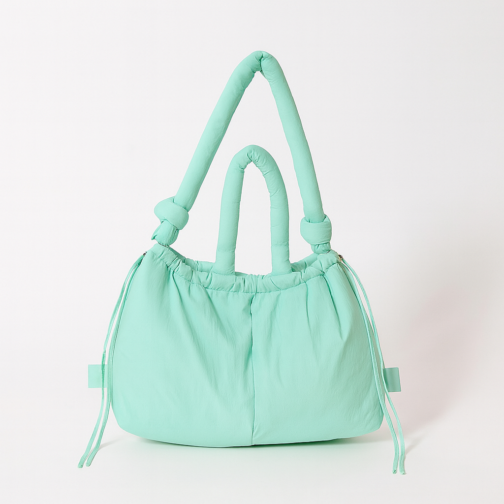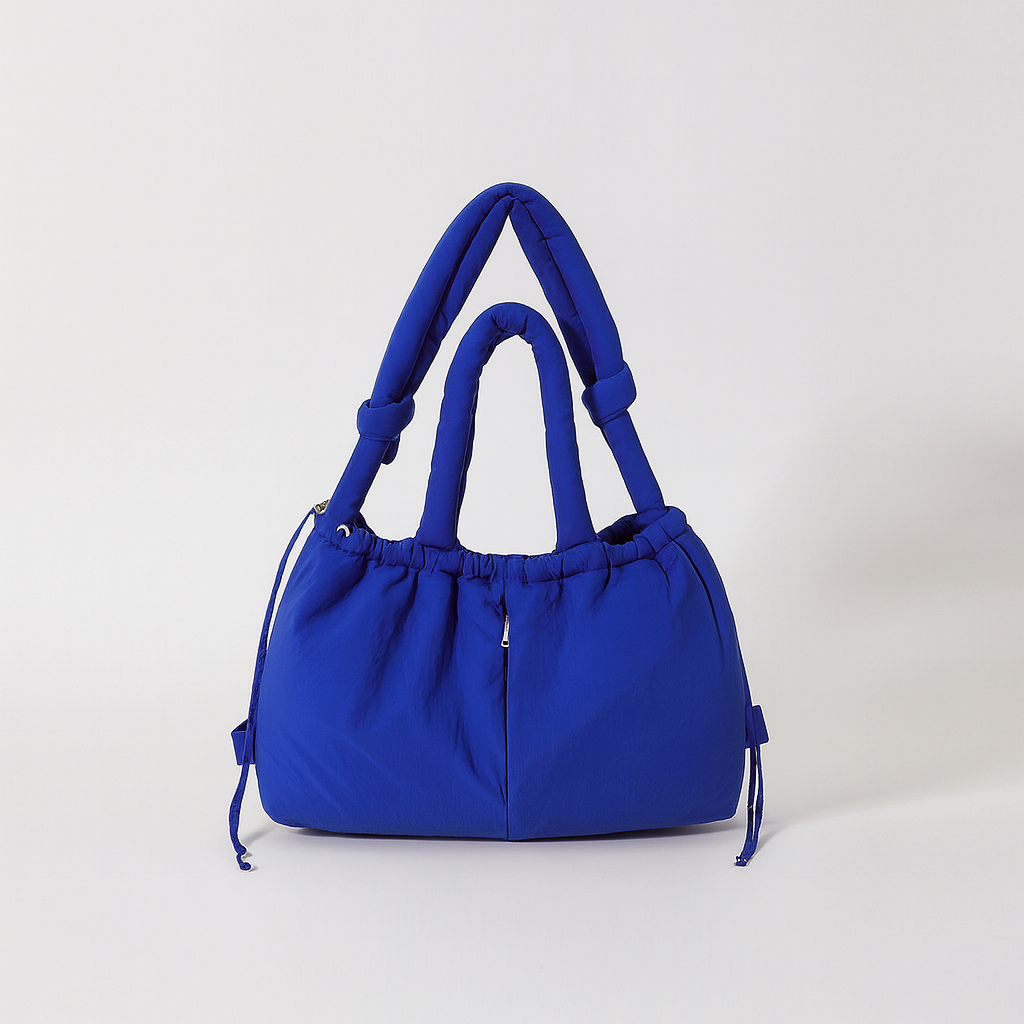 Femme en chemise blanche et jean, portant un grand sac à main bleu clair en tissu matelassé. Mode décontractée, accessoires tendance.