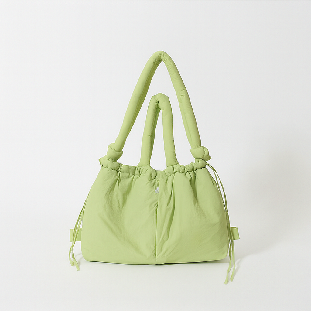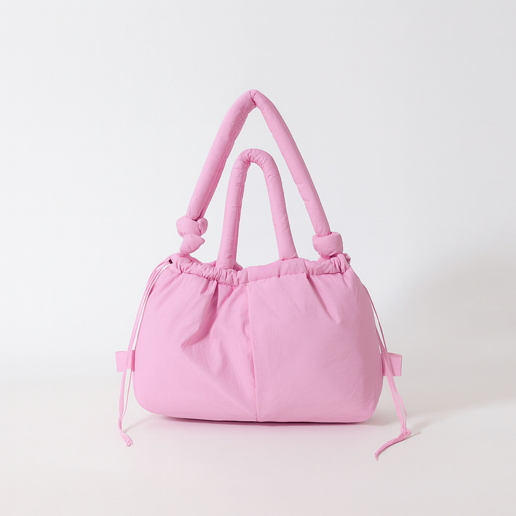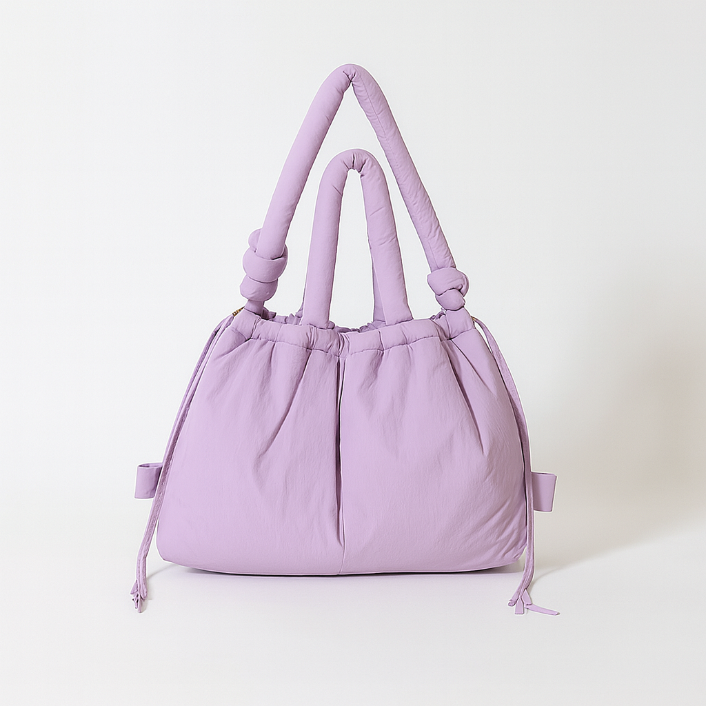 Femme en chemise blanche et jean, portant un grand sac à main bleu clair en tissu matelassé. Mode décontractée, accessoires tendance.