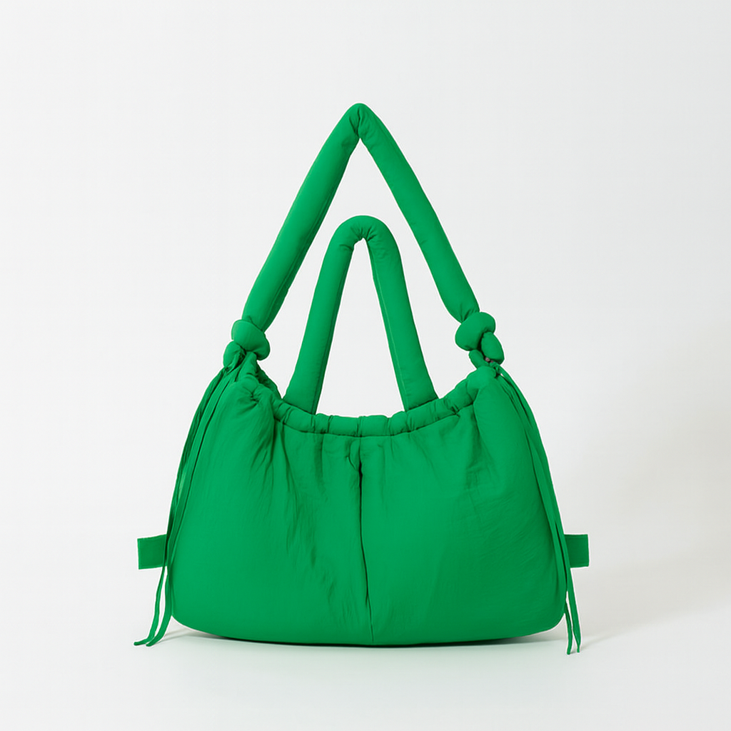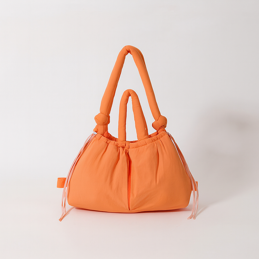 Femme portant un sac à main matelassé orange vif, design moderne et spacieux, idéal pour la mode urbaine et les sorties quotidiennes.