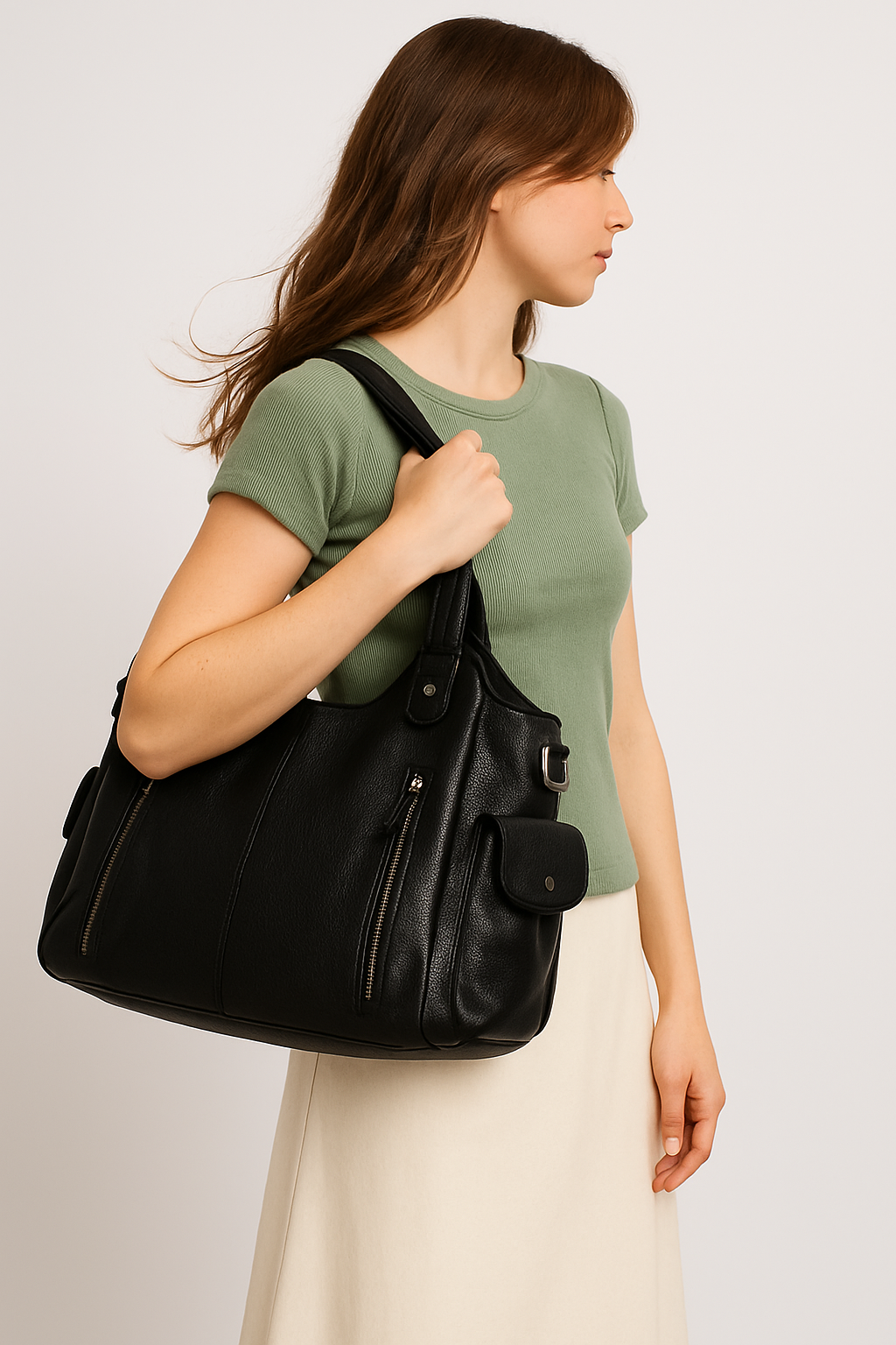 Femme portant un sac à main noir en cuir, design élégant avec poches zippées, tenue décontractée, t-shirt vert, jupe beige, mode féminine tendance.