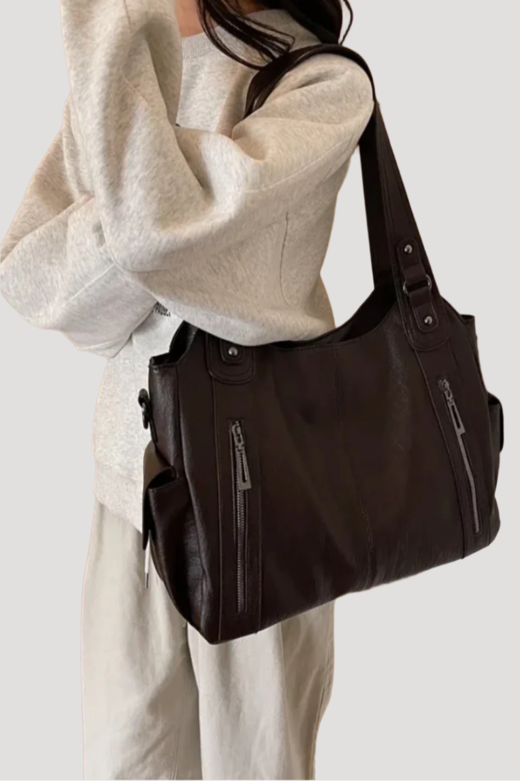 Femme portant un sac à main en cuir noir avec fermetures éclair, tenue décontractée en sweat gris et pantalon beige. Mode, accessoires, élégance.