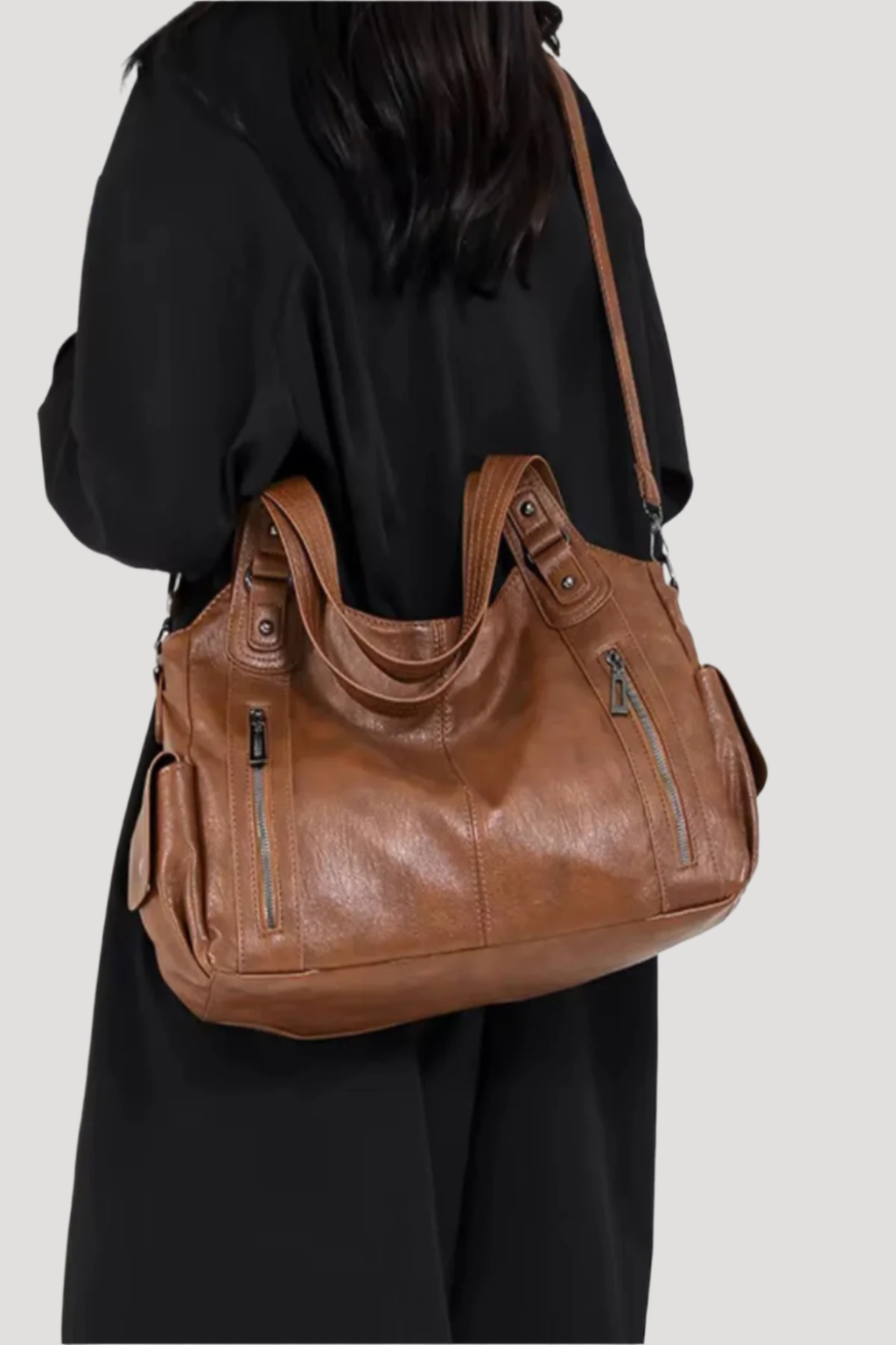 Sac à main en cuir marron porté par une personne en manteau noir, avec fermetures éclair et anses robustes. Accessoire mode élégant et pratique.
