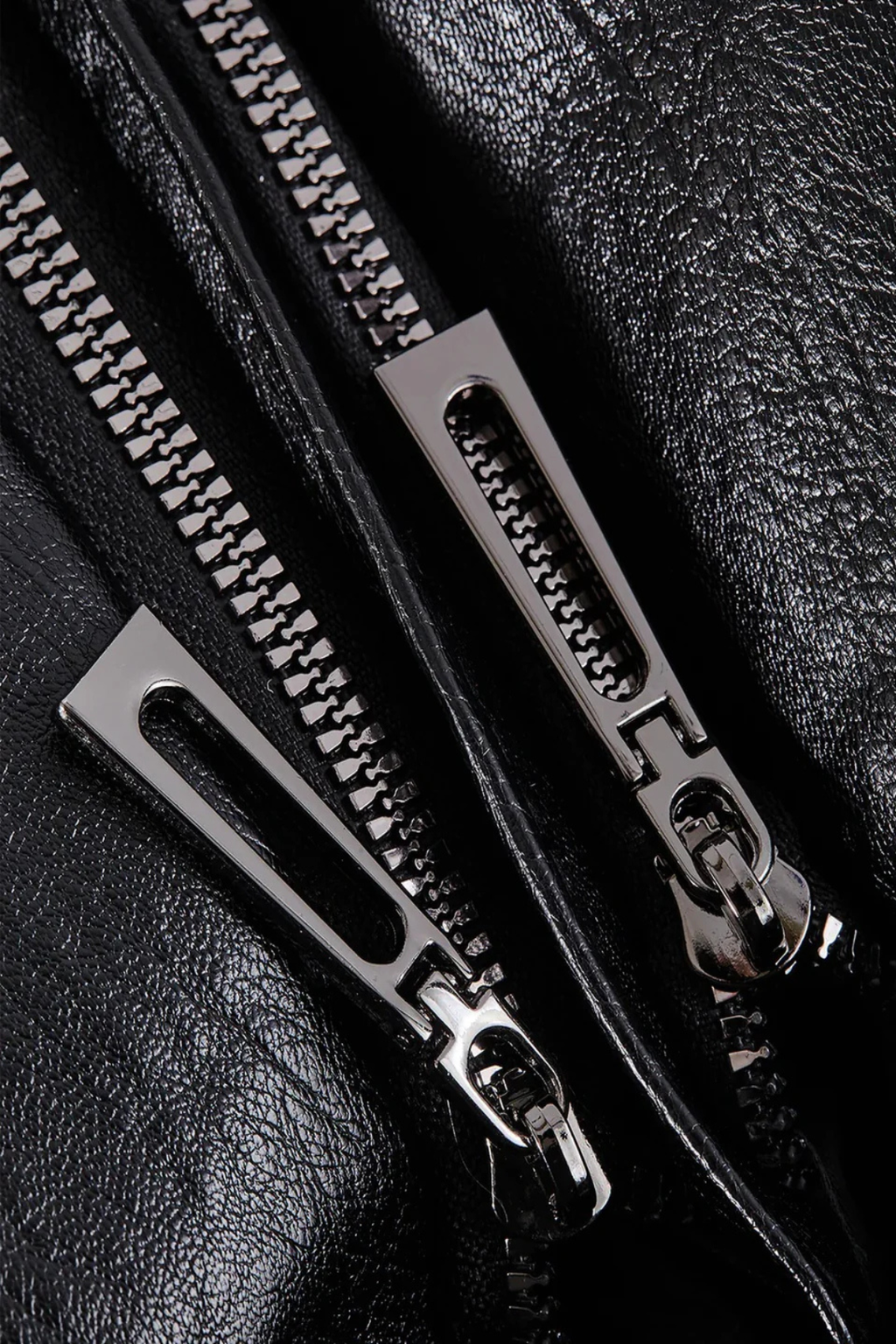 Gros plan sur une fermeture éclair métallique double sur un blouson en cuir noir, texture brillante. Mode, accessoires, vêtements en cuir.