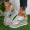 Sandales compensées marron en cuir texturé, portées avec un jean déchiré. Chaussures d&
