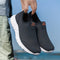 Chaussures de sport noires en maille respirante, semelle blanche, portées en extérieur sur fond de mer. Confortables et légères pour la marche.