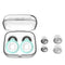 Étui transparent avec écouteurs sans fil turquoise et embouts interchangeables. Accessoires audio modernes, design élégant, technologie Bluetooth.
