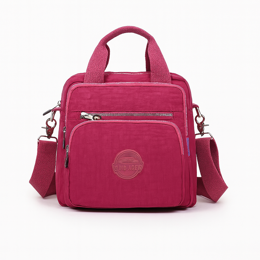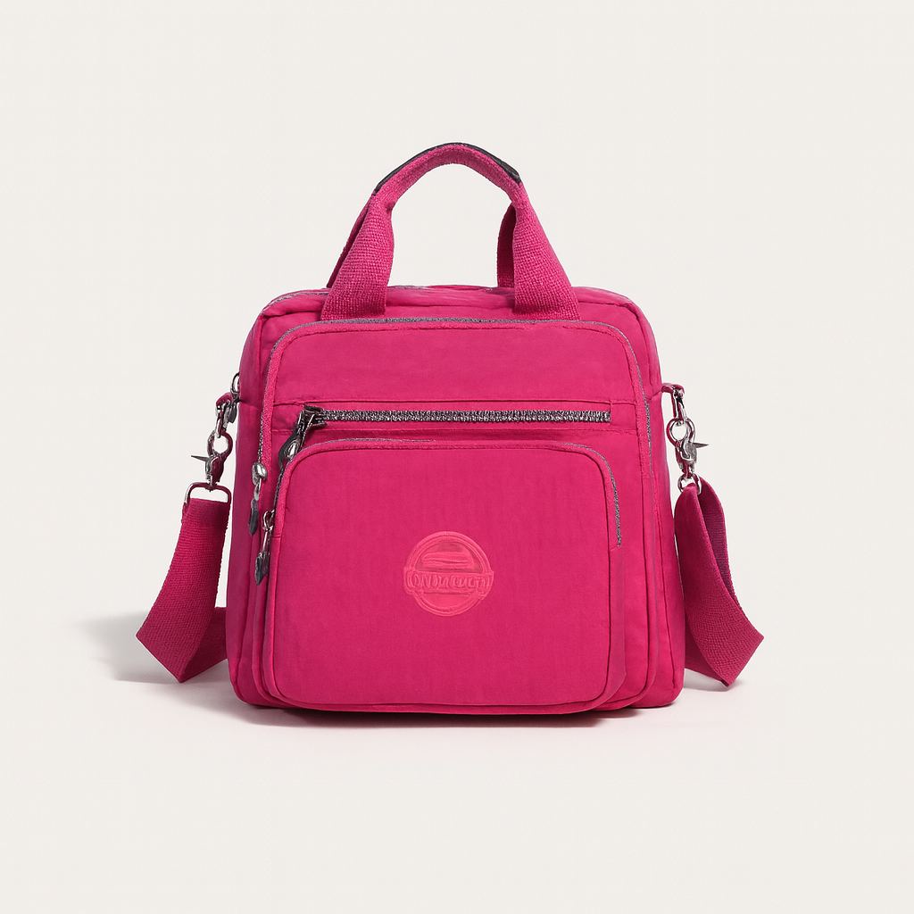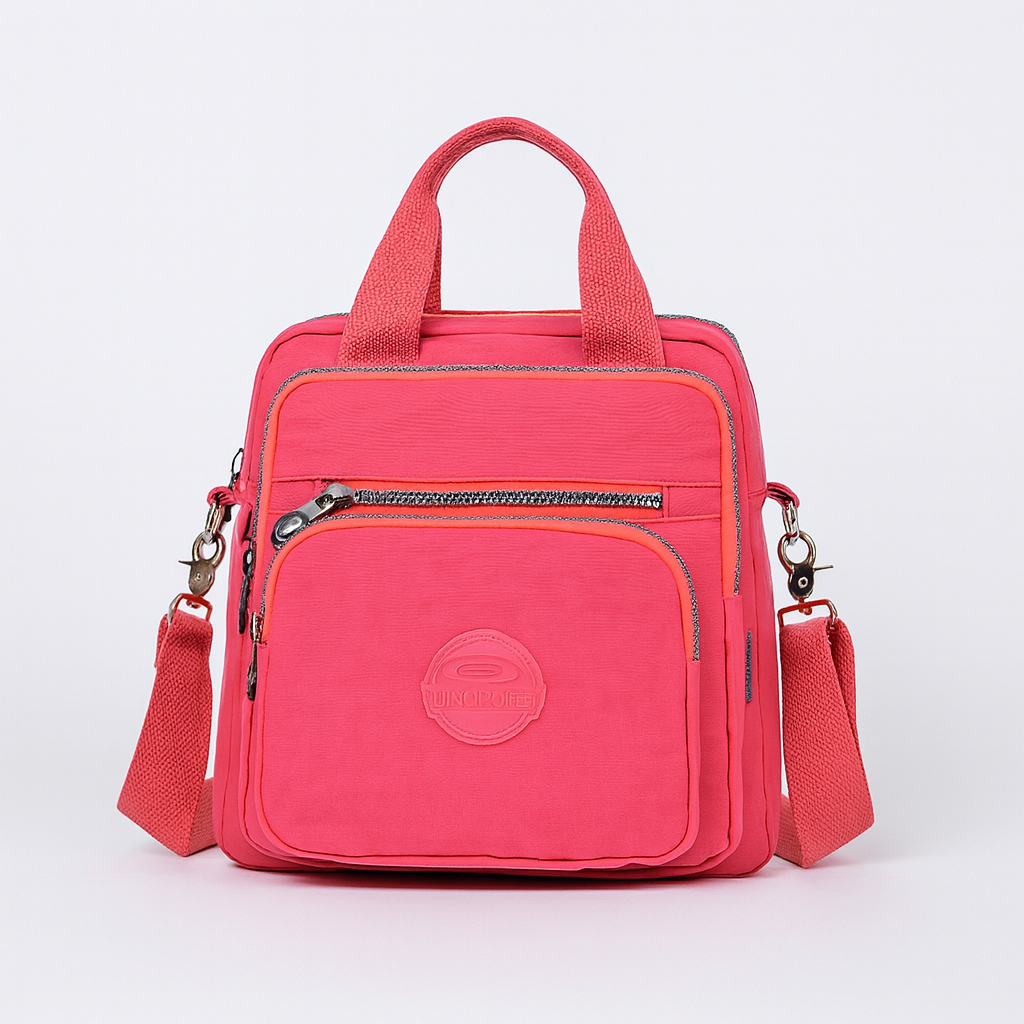 Sac à main rose multifonctionnel en toile, avec bandoulière réglable, poches zippées, design moderne. Accessoire mode femme pratique et élégant.